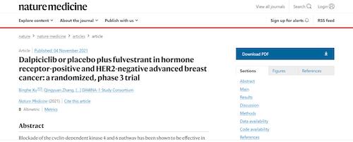 11月4日,国际四大医学期刊之一、英国《自然》旗下《自然医学》(Nature Medicine)在线发表CDK4/6抑制剂达尔西利(SHR6390)联合氟维司群治疗既往内分泌治疗后疾病进展的HR+/HER2-晚期乳腺癌的多中心、随机、双盲III期临床研究(DAWNA-1研究)中期分析结果报告,首次对氟维司群(雌激素受体降解剂)±达尔西利治疗激素受体阳性晚期乳腺癌的有效性和安全性进行了比较。研究结果显示,达尔西利+氟维司群组与安慰剂+氟维司群组相比,无进展生存期(PFS)显著延长。该项研究由中国医学科学院肿瘤医院徐兵河教授担任leading PI,全国39家医院参研,由ag真人国际官网医药临床研发团队支持完成。