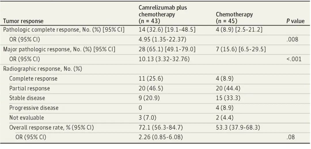 北京时间8月3日,ag真人国际官网医药创新药卡瑞利珠单抗联合化疗(Cam+CT)对比化疗(CT)新辅助治疗ⅢA/ⅢB (T3N2) 期非小细胞肺癌(NSCLC)结果在线发表于国际权威期刊JAMA Oncology[1]。该研究是由空军军医大学唐都医院姜涛教授、雷杰教授团队联合陕西省肿瘤医院雷光焰教授团队、兰州大学第二附属医院王成教授团队共同参与的一项随机对照、多中心、Ⅱ期临床研究(TD-FOREKNOW,NCT04338620)。研究结果显示,与化疗相比,卡瑞利珠单抗联合化疗新辅助治疗NSCLC显著提高了病理完全缓解(pCR)率(32.6% vs 8.9%,OR=4.95,95% CI :1.35-22.37, P =0 .008),且安全性良好。本研究是卡瑞利珠单抗新辅助治疗可切除NSCLC患者的首个随机对照研究,为NSCLC新辅助免疫治疗再添新证。